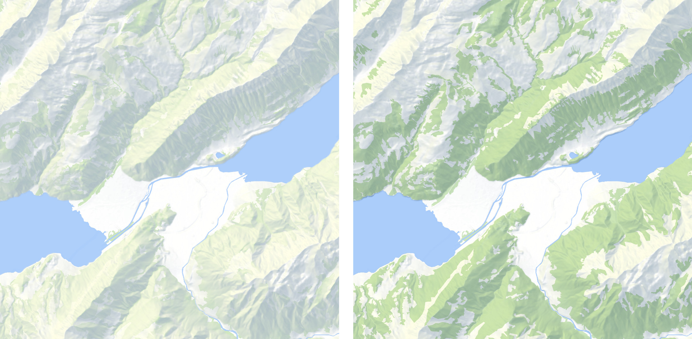 The left image uses normal and the right image uses multiply blending. Interlaken, Switzerland. Lake / forest data from OpenStreetMap, terrain data from Mapterhorn.
