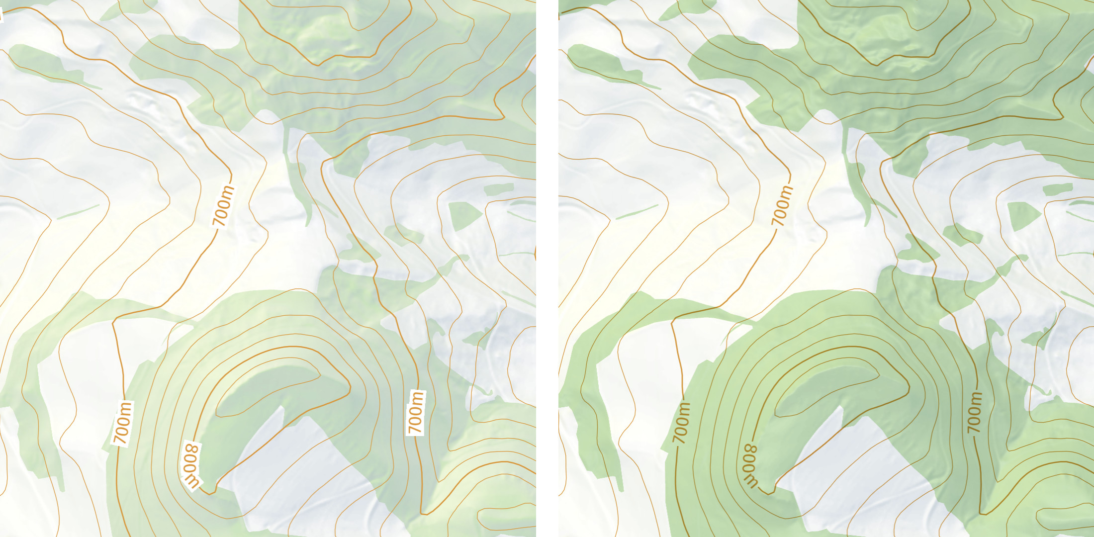Left image: contour lines with labels that have a white halo superimposed on hillshading and forests with normal blending. Right: same with multiply blending. Jura hills near Aarau, Switzerland. Forest data from OpenStreetMap, terrain data from Mapterhorn.